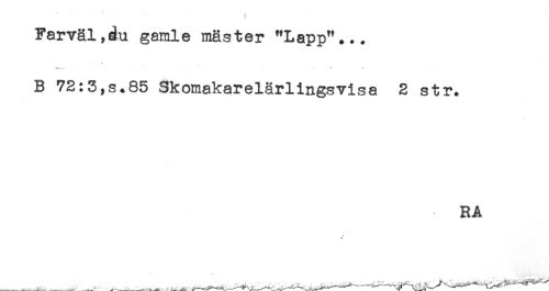 //// Farväl,du gamle mäster "Lapp"... //// B 72:3,s.85 Skomakarelärlingsvisa 2 str. //// RA ////