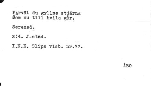 //// ) //// ) //// Farväl du gyllne stjärna //// Som nu till hvila gar. //// < //// Serenad. //// t //// 2:4. J-stad. //// I.N.E. Slips visb. nr.77. //// ÅBO ////