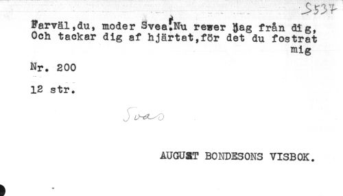 //// Farväl,du, moder Svea^Nu rewer ^ag från dig, //// Och tackar dig af hjärtat,för det du fostrat //// mig //// Nr. 200 //// 12 str. //// AUGUST BONDESONS VISBOK. ////