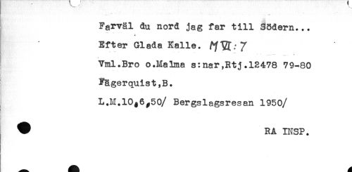 //// -- * ',** //// Farväl du nord jag far till Södern... //// Efter Glada Kalle. //// Vml.Bro o.Malma s:nar,Rtj.12478 79-80 //// Fägerquist,B. //// g ' //// L.M.10^6^50/ Bergslagsresan 1950 //// /# RA INSP. ////