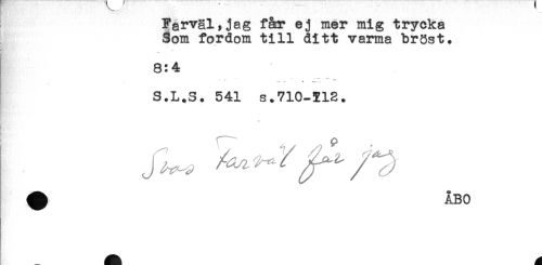 //// Farväl,jag får ej mer mig trycka //// Som fordom till ditt varma bröst. //// B' ' - " ' //// [ 8:4 //// ' ** ** # //// S.L.S. 541 s.710-HS. //// ! //// j ^ ^ ^ ^ ^ ^ //// ^ ÅBO ////