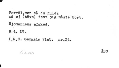 //// Farväl,men så du hulda //// må ej (bäva) fast jag måste bort. //// t* ; //// Sjömannens afsked. //// 9:4. LT. //// I.N.E. Gammals visb. nr.34. //// , . ABO ////