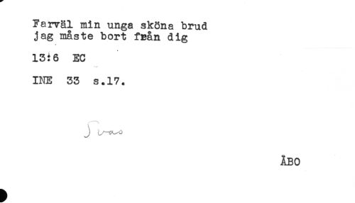 //// Farväl min unga sköna brud //// jag måste bort fBån dig //// * //// 13:6 EC //// - //// INE 33 s.17. //// ÅBO ////