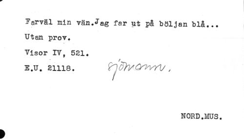 //// Farväl min vän.Jag far ut på böljan blå... //// Utan prov. //// * //// Visor IV, 521. //// * //// E.U. 21118. //// NORD.MUS. ////