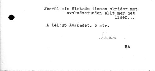 //// ! //// Farväl min älskade timman skrider mot //// avskedsstunden allt mer det //// ^ lider... //// A 141:83 Avskedet. 6 str. //// RA ////