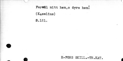 //// Farväl mitt hem,o dyra hem! //// -- --- . ^ //// l) //// (Kaselius) //// S.121. //// - //// ^ H-FORS SKILL.-TR.KAT. ////