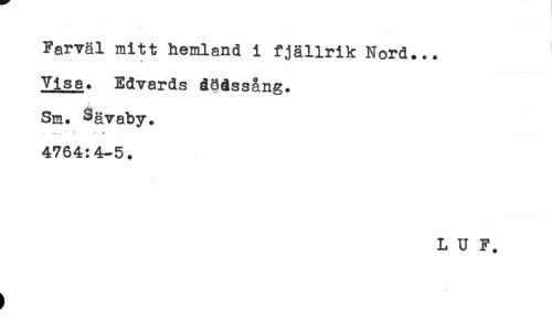 //// Farväl mitt hemland i fjällrik Nord... //// . . * * - //// Visa. Edvards dödssång. //// i //// Sm. Sävaby. //// * * * * //// 4764:4-5. //// * //// L U F. //// * ////