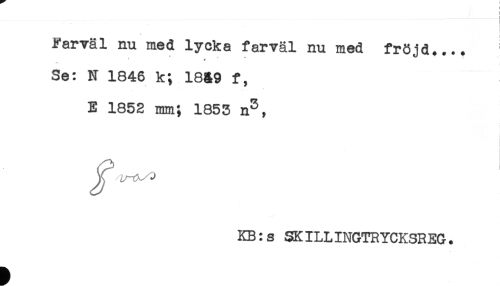 //// _____L_j //// Farväl nu med lycka farväl nu med fröjd.... //// Se: N 1846 k; 18&9 f, //// E 1852 mm; 1855 n^, //// Jr . j //// KB:s SKILLINGTRYCKSREG. ////