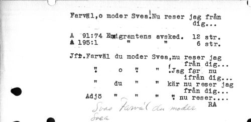 //// - ' * ^ - .....-- . ^ . ., ... _ //// A //// Farväl,o moder SvealNu reser jag från //// dig... //// ^ - ** * //// A 91:74 EiHigrantens avsked. 12 str. //// A 195:1 " " 6 str. //// Jfi?.Farväl du moder Svea,nu reser jag //// , från dig... //// T o S " LJag far nu //// ifrån dig... //// " du " " kär nu reser jag //// ^^ från dig... //// ^ Adjö "r- " " T nu reser.... ////