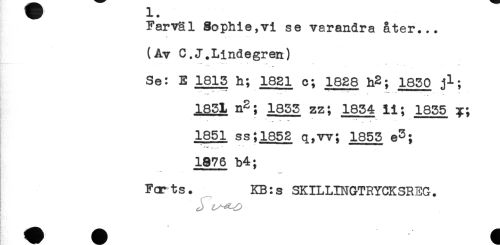 //// JL # //// Farväl 8ophie,vi se varandra åter.,. //// (Av C.J.Lindegren) //// * ** . - . * * //// Se: E 1813 h; 1821 c; 1828 h2; 1830 jl; //// * . * * * - //// 1831 n2; 1833 zz; 1834 11; 1835 //// " . - ' ********** //// 1851 ss; 1852 q,w; 1853 e^; //// ************* //// 1876 b4; //// -K*. //// Fcr ts. KB: s SKILLINGTRYCKSREG. //// L //// } ////