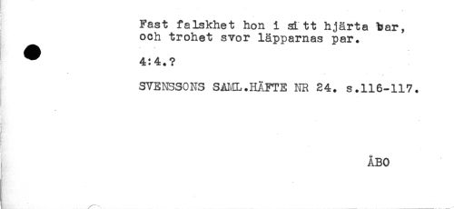 //// Fast falskhet hon i sitt hjärta bar, //// och trohet svor läpparnas par. //// ^ 4:4.? //// T //// SVENSSONS SAIA.HÄFTE NR 24. s.116-117. //// ] //// ** //// ÅBO ////