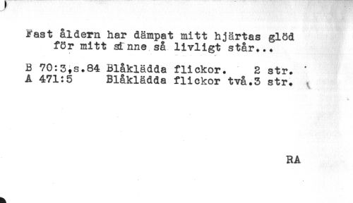 //// Fast åldern har dämpat mitt hjärtas glöd //// för mitt sinne så livligt står... //// .. - * ? //// B 70:3,s.84 Blåklädda flickor. 2 str. ' //// A 471:5 Blåklädda flickor två.3 str. . //// RA ////