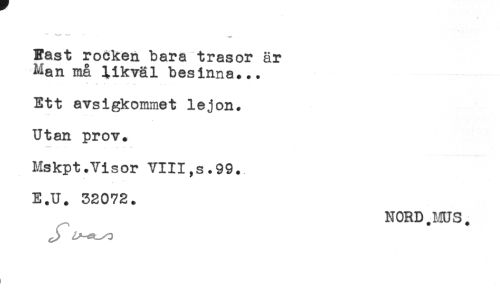 //// *** -<-J* //// Bast rocken bara trasor är //// Man må Hkväl besinna... //// Ett avsigkommet lejon. //// Utan prov. //// -*..... - - .. . //// Mskpt.Visor VIII,s.99. //// E.U. 32072. //// NORD.MUS, ////