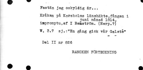 //// Fastän jag oskyldig är... //// Kråkan på Korsholms länehäkte,fången i //// juni månad 1814, //// impromptu,af I Renström. (Nerp.?) //// *** - + //// W. 3.7 sj.:"En gång gick vår Galaté" //// Del II nr 826 //// I //// RANCKEN FÖRTECKNING //// . ////