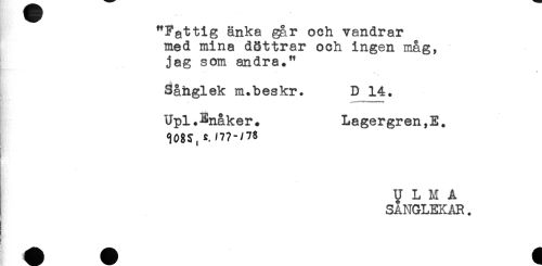 //// "Fattig änka går och vandrar //// med mina dBttrar och ingen måg, //// jag som andra." //// Såhglek m.beskr. D 14. //// - *" ** //// Upl.Enåker. Lagergren. //// U L M A //// SÅNGLEKAR. ////
