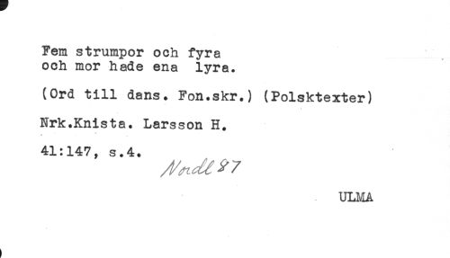 //// Fem strumpor och fyra //// och mor hade ena lyra. //// (Ord till dans. Fon.skr.) (Polsktexter) //// Nrk.Knista* Larsson H. //// * //// 41:147, s.4. //// ULMA ////