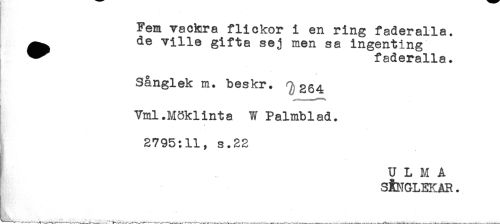 //// Fem vackra flickor i en ring faderalla. //// ^ de ville gifta sej men sa ingenting //// ^^ faderalla. //// Sånglek m. beskr. - //// Vml.Möklinta W Palmblad. //// 2795:11, s.22 //// U L M A //// SÅNGLEKAR. ////