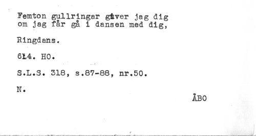 //// Femton gullringår giver jag dig //// om jag får gå i dansen med dig, //// Ringdans. //// 61,4. HO. //// ... //// S.L.S. 318, s.87-88, nr.50. //// N. //// ÅBO ////