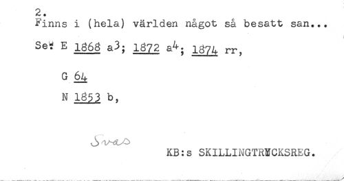 //// Finns i (hela) världen något så besatt san... //// Se* E lg68 a3; 1872 a^; ig^å rr, //// G 64 //// N 1853 b, //// KB:s SKILLINGTRNCKSREG. ////