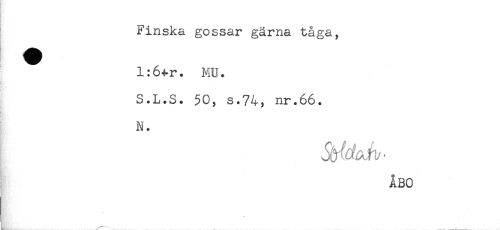 //// Finska gossar gärna tåga, //// l:64-r. MU. //// S.L.S. 50, s.74, nr.66. //// i //// N. //// ÅBO //// . //// <\ ^ . _-____ ////