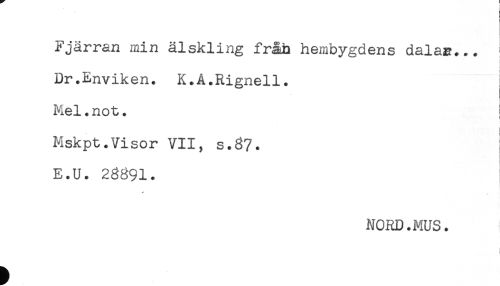 //// Fjärran min älskling fråh hembygdens dalas... //// Dr.Enviken. K.A.Rignell. //// Mel.not. //// t //// Mskpt.Visor VII, s.37. //// E.U. 23391. //// NORD.MUS. //// j ////