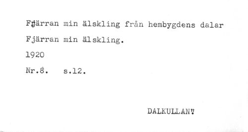 //// Fpärran min älskling från hembygdens dalar //// Fjärran min älskling. //// 1920 //// Nr.s.12. //// DALKULLAN? ////