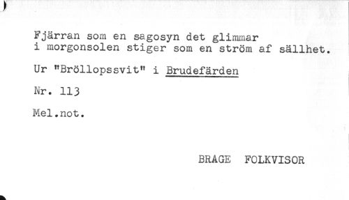 //// Fjärran som en sagosyn det glimmar //// i morgonsolen stiger som en ström af sällhet. //// Ur "Bröllopssvit" i Brudefärden //// Nr. 113 //// Mel.not. //// i //// BRAGE FOLKVISOR ////