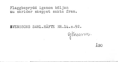 //// Flaggbeprydd igenom böljan //// nu skrider skeppet sakta fram. //// SVENSSONS SAML.HÄFTE NR.14.S.92. //// ÅBO //// //// /