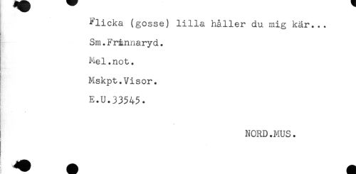//// Flicka (gosse) lilla håller du mig kär... //// Sm.Frmnnaryd. //// Mel.not. //// I Mskpt.Visor. //// n* //// ! //// E.u.33545. //// * //// NORD.MUS. ////