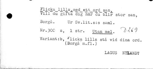 //// Fl i c k a_l i 11 a_jne d_ et t_o r d_ san_^ //// ^ Vill du gifta dig när du blir stor san, //// Borgå. Ur Sv.lit.s:s saml. //// ^ Nr.30C a, lstr. Utan mel. //// Variant:b, ^licka lilla stå vid dina ord. //// (Borgå m.fl.) //// LAGUS KYEANDU ////