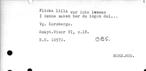 //// !' . //// j //// Flicka lilla ^r inte lessen //// I denna saken har du ingen del... //// Vg. Korsberga. //// Mskpt.Visor VI, s.18. //// E.U. 22572. //// ^ NORD.MUS. //// . ////