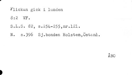 //// Flickan gick i lunden //// 8:2 VF. //// S.L.S. 82, s.254-255,nr.121. //// N. s.396 Sj.bonden Holsten,Östanå. //// ÅBO ////