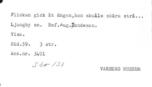 //// Flickan gick åt ängen,hon skulle skära strå... //// Ljungby sn. Ref.Aug.bondeson. //// Visa. //// Sid.59. 3 str. //// Åcc.nr. 3491 //// J ' ^ //// VARBERG MUSEUM ////