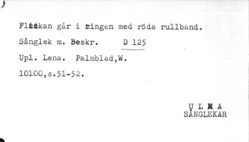 //// Fliékan går i tingen med röda rullband. //// Sånglek m. Beskr. D 125 ^ //// Upl. Lena. Palmblad,W. //// 10100,s.51-52. //// < //// U L H A //// SÅNGLEKAR ////