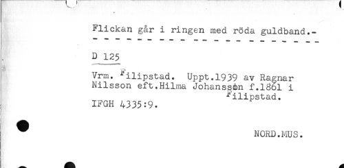 //// Flickan går i ringen med röda guldband.- //// D 125 //// ? F //// Vrm. ^ilipstad. Uppt. 1939 av Ragnar //// Nilsson eft.Hilma Johanssdm f.l8bl i //// *( //// ^ilipstad. //// IFGH 4335:9. //// < ////