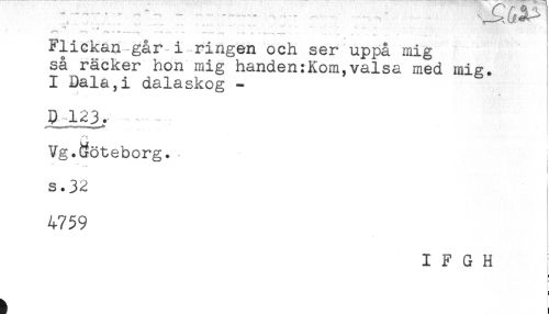 //// ' ' - - ' ' ' ' ..... //// - - -.....- - -- - - - - , . ..... -.... //// Flickangår-i.ringen och ser uppå mig //// så räcker hon mig handen:Kom,valsa med mig. //// I Dala,i dalaskog - //// ^ "-'IL2^ #* --- - --- - //// Jl" ' " *)H* //// Vg.ööteborg.- ; //// s.32 //// 4759 //// < ////