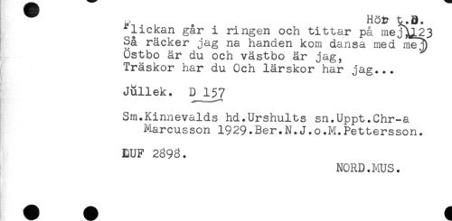 //// H-n . Höt? t.B. //// "-lickan gar i ringen och tittar på mej^23 //// Så räcker jag na handen kom dansa med mel) //// Östbo är du och västbo är jag, //// Träskor har du Och lärskor har jag... //// Jullek. D 157 //// Sm.Kinnevalds hd.Urshults sn.Uppt.Chr-a //// Marcusson 1929.Ber.N.J.o.M.Pettersson. //// DUF 2698. //// NORD. FiUS. ////