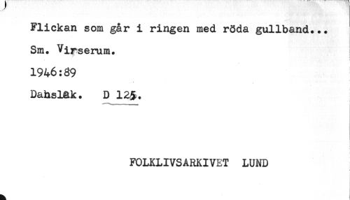 //// Flickan som går i ringen med röda gullband... //// Sm. Virserum. //// ! //// 1946:89 //// t //// t //// Dahsiak. D 12%. //// FOLKLIVSARKIVET LUND ////