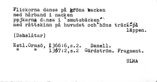 //// Flickorna dansa på &föna backen //// med hårband i nacken //// ppjkarng. dansa i * smutsbäcken* //// med råttskinn på huvudet och*höns träcR-på //// läppen. //// (Dahslåtar) //// Estl.Ormsö, 1366:6,s.2. Danell. //// ^ " 13$7:2,s.2 Gärdström. Fragment. //// ULMA ////