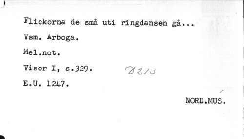 //// Flickorna de små uti ringdansen gå... //// Vsm. Arboga. //// Mel.not. //// Visor I, s.329. ^ //// E.U. 1247. //// NORD.MUS. //// s //// f ////