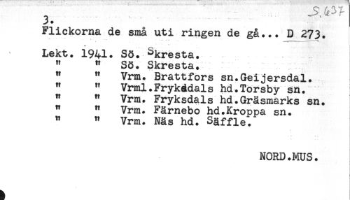 //// 3. //// Flickorna de små uti ringen de gå... D 273. //// Lekt. 1941. Sö. fresta. //// " " Sö. Skresta. //// " " Vrm. Brattfors sn.Geijersdal. //// " " Vrml.Frykddals hd.Torsby sn. //// " " Vrm. Fryksdals hd.Gräsmarks sn. //// " " Vrm. Färnebo hd.Kroppa sn. //// " " Vrm. Näs hd. Säffle. //// NORD.MUS. //// - //// ! //// - ////