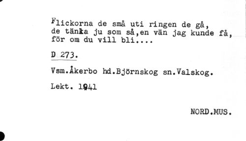 //// *lickorna de små uti ringen de gå, //// de tänka ju som så,en vän jag kunde få, //// för om du vill bli____ //// D 273. //// Vsm.Åkerbo hd.Björnskog sn.Valskog. //// Lekt. 1Q41 //// NORD.MUS. ////