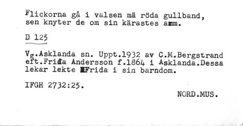 //// Flickorna gå i valsen mä röda gullband, //// sen knyter de om sin kärastes anm. //// D 125 //// Vp.Asklanda sn. Uppt.1932 av C.M.Bergstrand //// eft.Frida Andersson f.1864 i Asklanda.Dessa //// lekar lekte HFrida i sin barndom. //// IFGH 2732:25. //// NORD.MUS. ////