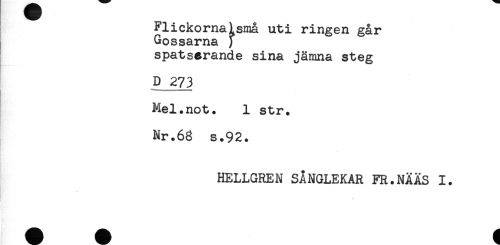 //// Flickornaismå uti ringen går //// Gossarna ; //// spatserande sina jänma steg //// D 273 //// Mel.not. 1 str. //// Nr.68 s.92. //// HELLGREN SÅNGLEKAR FR.NÄÄS 1. //// ^ A ////