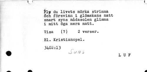 //// dn livets mörka strimma //// 8ch försvinn i glömskans natt //// snart syns nådasolen glimma //// i mitt öga mera matt. //// Visa (?) 2 verser. //// Bl. Kristianopel. //// 3402:13 //// + LUF ////