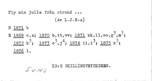 //// Fly min julle från strand ... //// (Air L.J.R-s) //// N 1871 b //// E 1868 o,x; 1870 1871 //// 1872 k^; 181^ o^, 18^ MI^ k^; //// 1876 1, //// KB:S SKILLINGTRYCKSREG. ////
