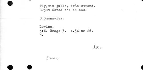 //// ^^ Fly,min julle, från strand. //// Skjut åstad som en and. //// Sjömansvisa. //// Lovisa. //// 3:6. Brage 3* s.34 nr 26. //// N. //// ÅBO. //// j ////