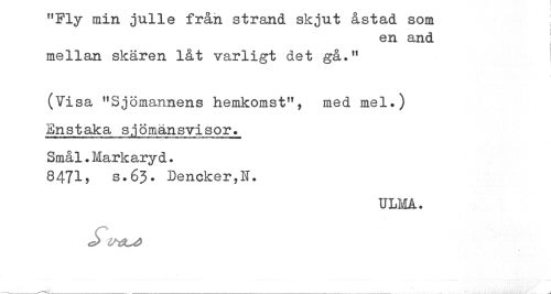 //// "ny mm juiie iran stråna sKjut astaa som //// en and I //// mellan skären låt varligt det gå." //// (Visa "Sjömannens hemkomst", med mel.) //// Enstaka sjömånsvisor. //// Smål.Markaryd. //// 8471, s.63. Dencker,N. //// ULMA. ////