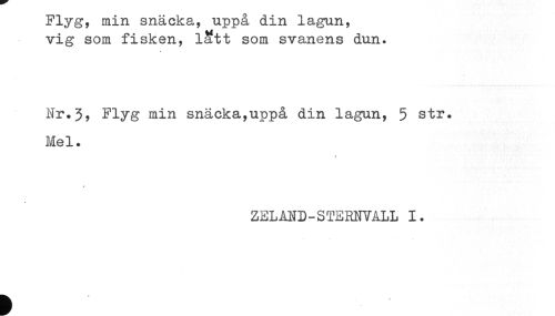 //// -Flyg, mm snacka, uppa dm lagun, //// vig som fisken, latt som svanens dun. //// Nr.3, Flyg min snäcka,uppå din lagun, 5 str. //// Mel. //// ZELAND-STERNVALL 1. ////