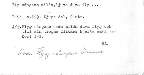 //// Fly sangens miiaa,ljuva auva ny ... //// B 94, s.129. Djupa dal, 9 str. //// t //// t //// Jfr.Flyg sångens ömma milda duva flyg och //// till min trogna flickas hjärta smyg ... //// Kort 1-2. //// RA. ////